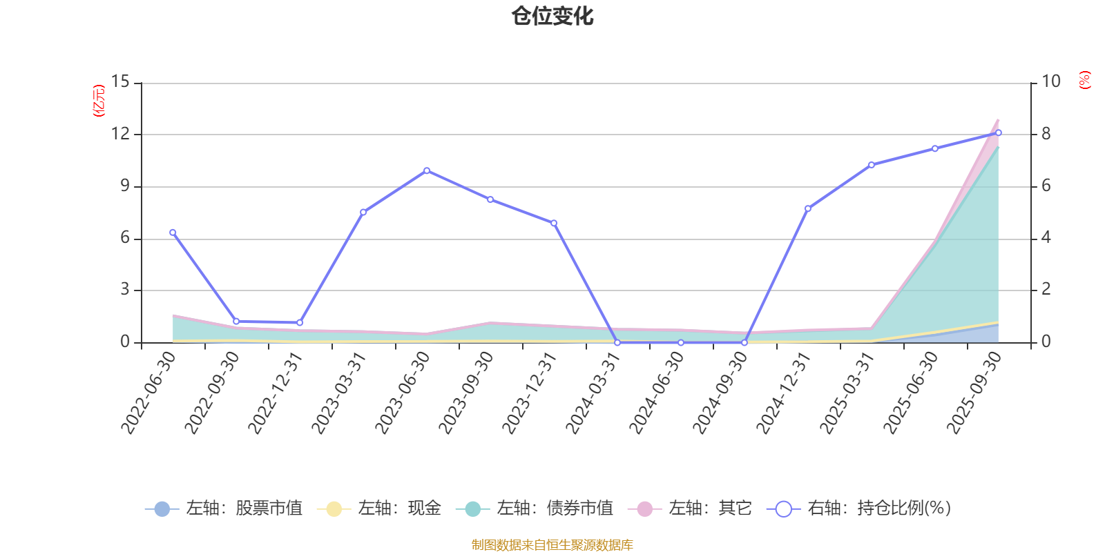 据定期报告数据统计,近三年平均股票仓位为4.17%,同类平均为19.03%。2025年三季度末基金达到8.08%的最高仓位,2022年末最低,为0.77%。