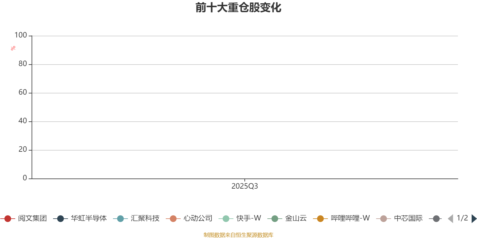 该基金持股集中度较高。截至2025年三季度末,基金十大重仓股分别是阿里巴巴-W、腾讯控股、快手-W、哔哩哔哩-W、华虹半导体、中芯国际、金山云、汇聚科技、阅文集团、心动公司。