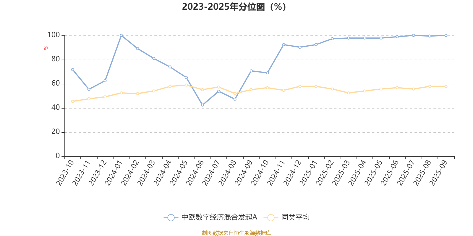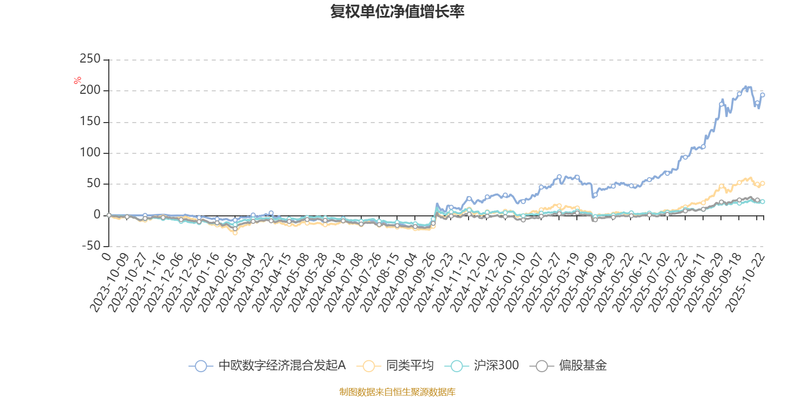 截至10月22日,中欧数字经济混合发起A近三个月复权单位净值增长率为51.78%,位于同类可比基金24/229;近半年复权单位净值增长率为106.27%,位于同类可比基金10/229;近一年复权单位净值增长率为156.49%,位于同类可比基金1/213。