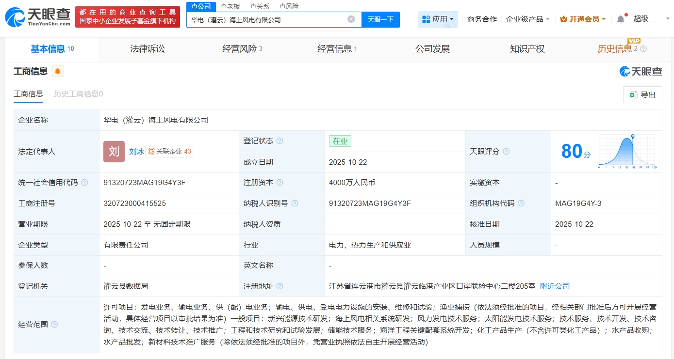 南方财经10月23日电,天眼查App显示,近日,华电(灌云)海上风电有限公司成立,法定代表人为刘冰,注册资本4000万人民币,经营范围包括新兴能源技术研发、海上风电相关系统研发、风力发电技术服务、太阳能发电技术服务等。股东信息显示,该公司由华电新能(600930)、远景能源有限公司等共同持股。
