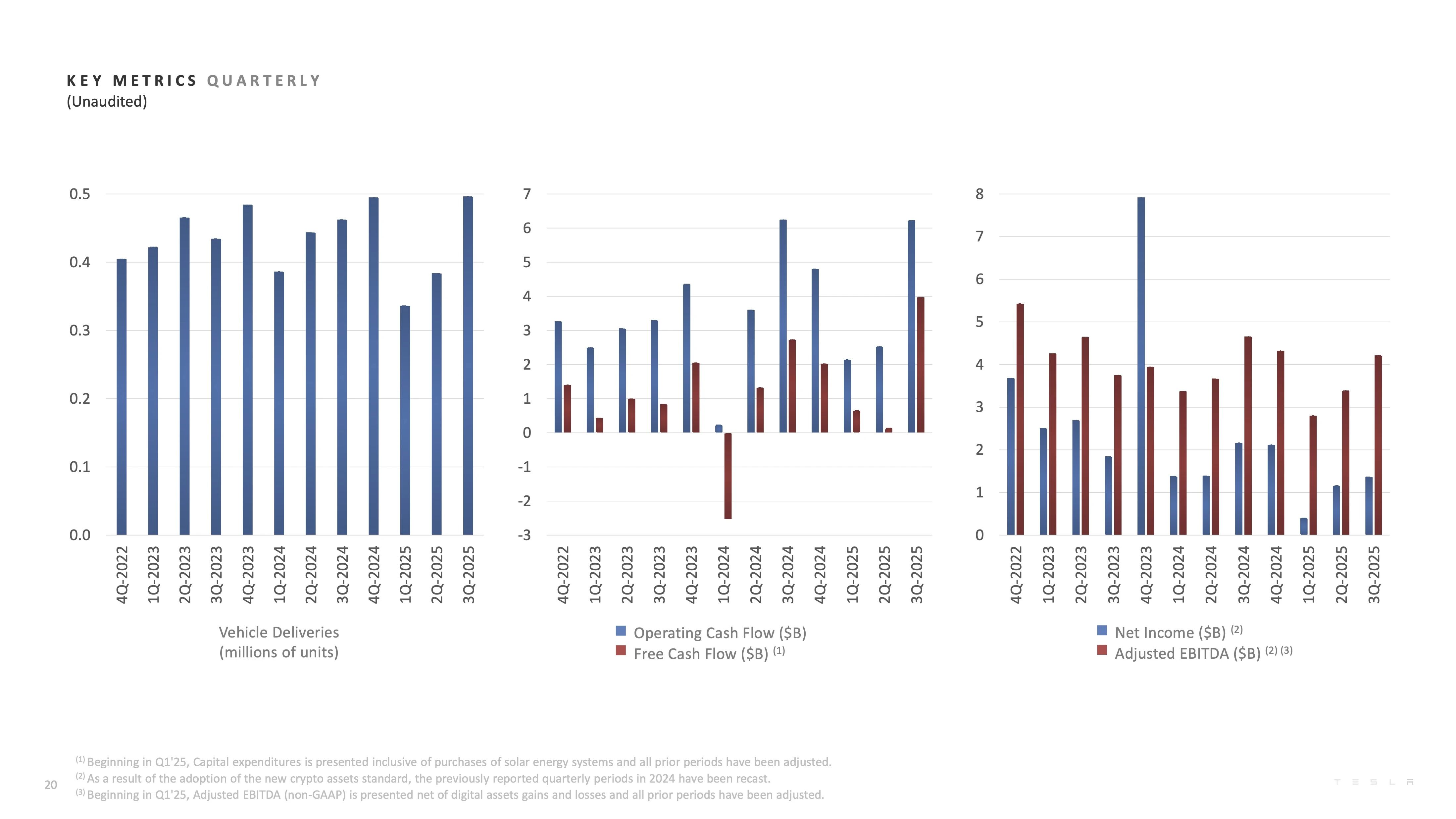 10月23日,特斯拉公布2025第三季度财报。特斯拉第三季度营收281亿美元,同比增长12%,超出预估的263.6亿美元。但利润下降,三季度调整后净利润17.7亿美元,同比下降29%,二季度同比下降23%。