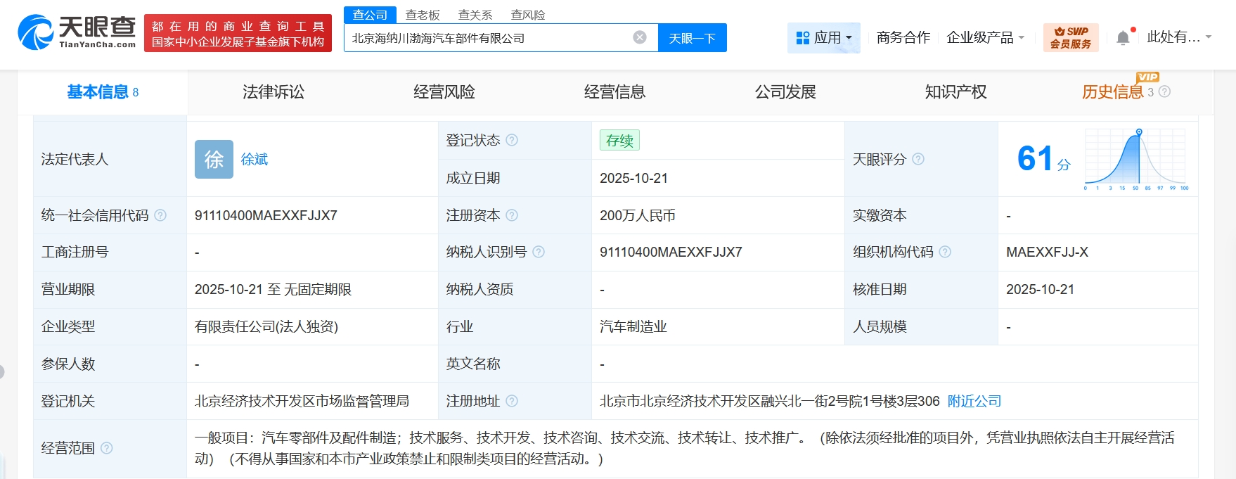 南方财经10月23日电,天眼查工商信息显示,近日,北京海纳川渤海汽车部件有限公司成立,法定代表人为徐斌,注册资本200万人民币,经营范围为汽车零部件及配件制造,技术服务、技术开发、技术咨询、技术交流、技术转让、技术推广。股东信息显示,该公司由北汽集团旗下北京海纳川汽车部件股份有限公司全资持股。