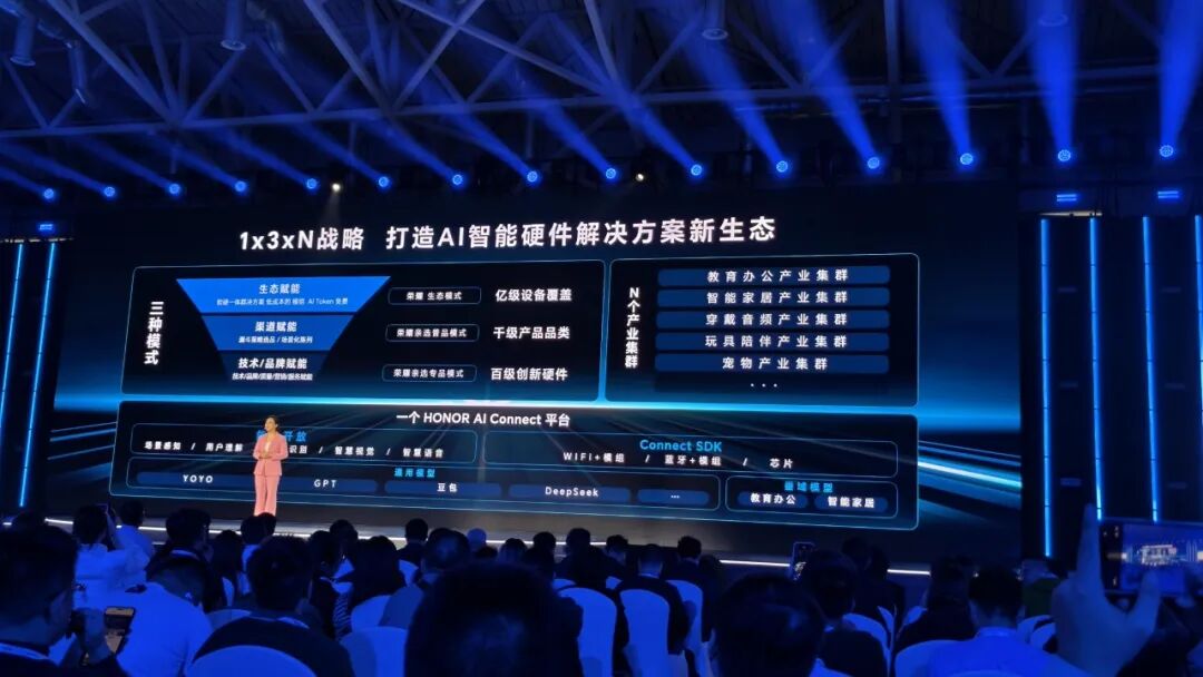 其中,“1”代表HONOR AI Connect平台,荣耀将把自己的AI能力开放给所有的生态合作伙伴;“3”代表扶持合作伙伴的三种模式,即“生态赋能”“渠道赋能”以及“技术与品牌赋能”;“N”代表N个产业集群,荣耀的智能互联生态将覆盖教育办公、智能家居、音频穿戴、玩具陪伴、宠物等N个产业。