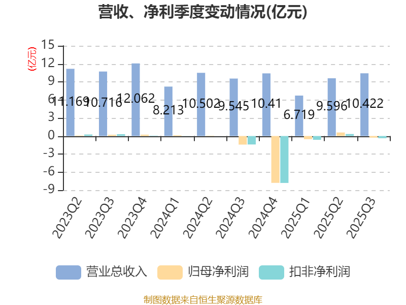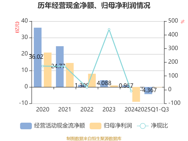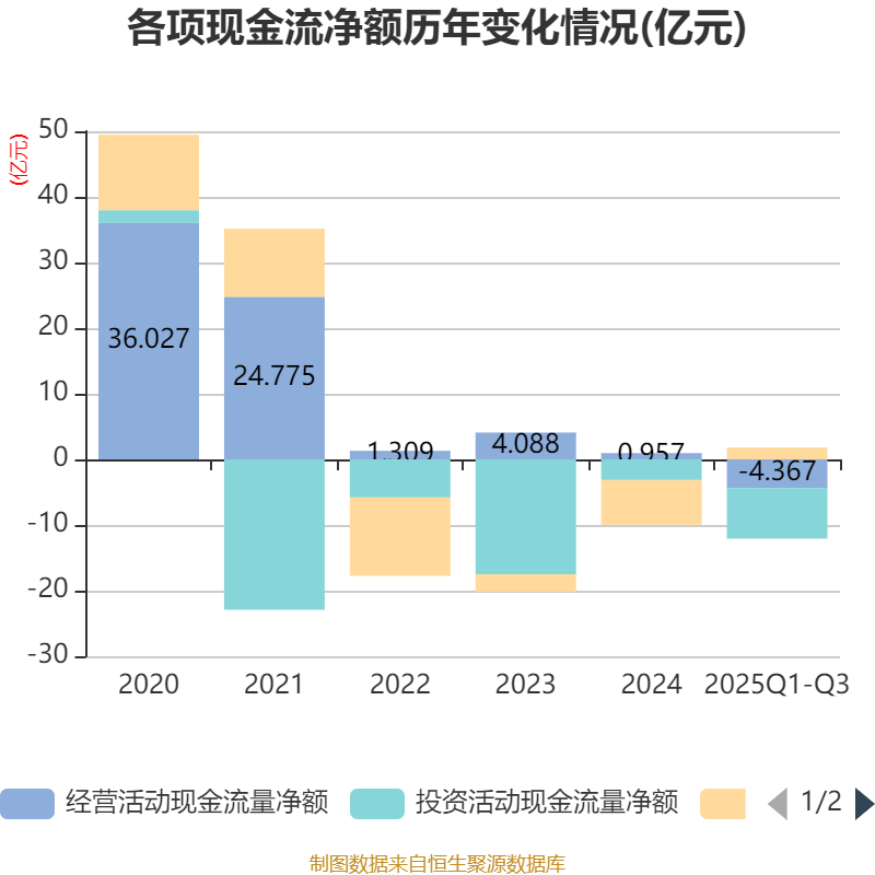 2025年前三季度,公司经营活动现金流净额为-4.37亿元,同比减少2.94亿元;筹资活动现金流净额1.8亿元,同比增加4.97亿元;投资活动现金流净额-7.71亿元,上年同期为-5.27亿元。
