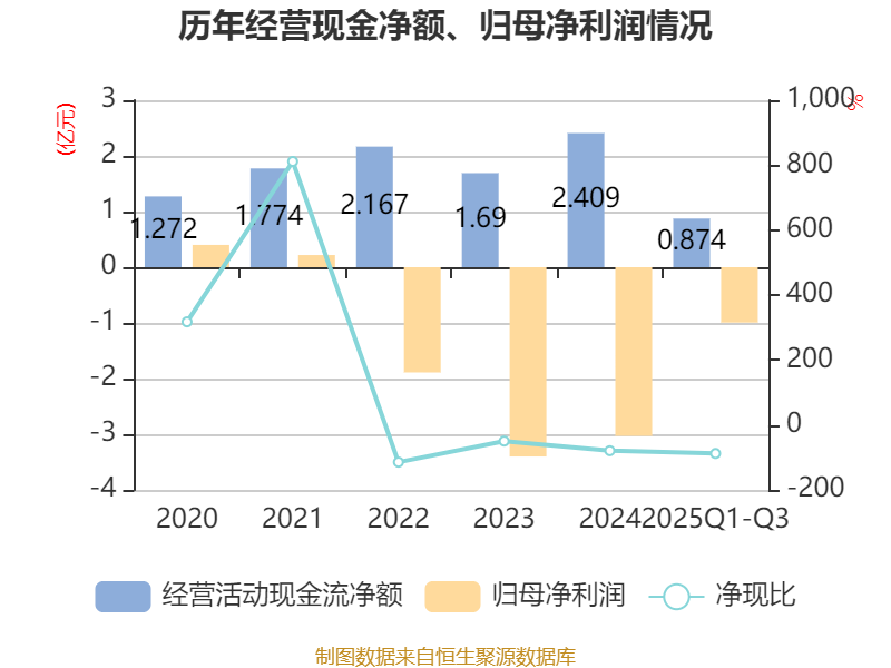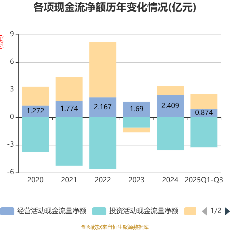 2025年前三季度,公司经营活动现金流净额为8741.56万元,同比下降49.77%;筹资活动现金流净额1.63亿元,同比减少3722.9万元;投资活动现金流净额-3.26亿元,上年同期为-3.66亿元。