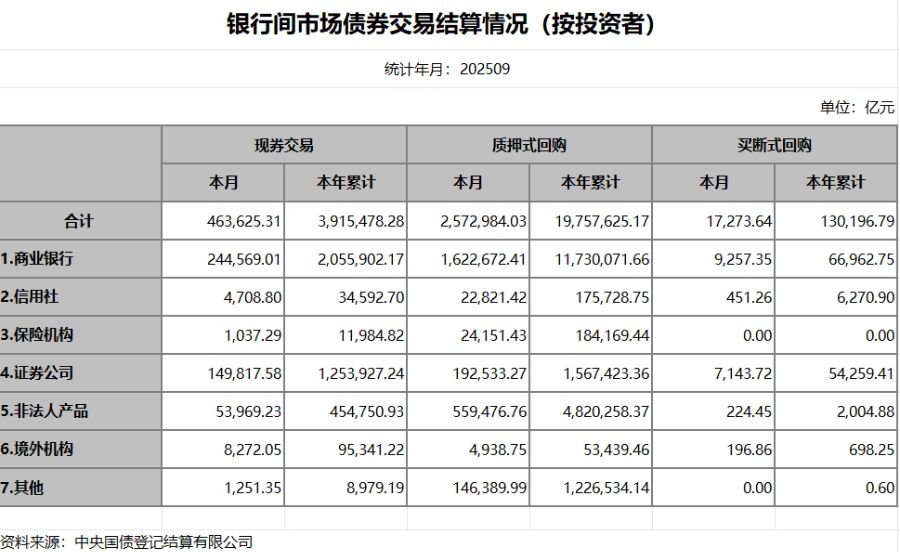 总体来看,9月银行间市场债券交易结算中,商业银行在现券和回购业务中仍占据主导地位,信用社活跃度明显提升,证券公司和非法人产品在部分业务领域参与度有所波动,市场整体维持以商业银行为核心、多元化机构共同参与的格局。