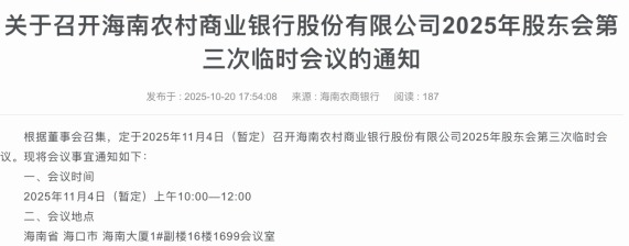 上证报中国证券网讯(记者徐潇潇)据海南农商行官网发布消息,该行将于11月初召开临时股东大会,其中,会议议案包括,关于审议《海南农村商业银行股份有限公司2025年股东会第三次临时会议计、监、唱票人名单》的议案,以及关于审议《海南农村商业银行股份有限公司对村镇银行改革重组》的议案。