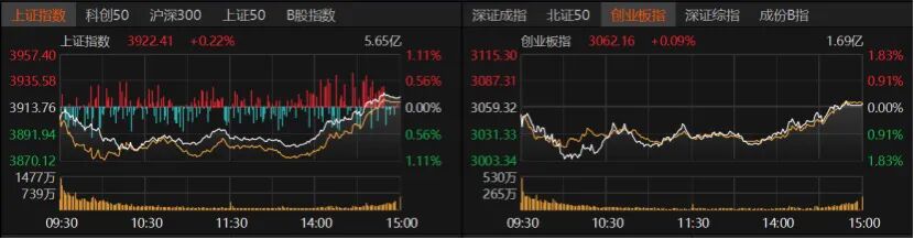 A股市场全天表现弱势,但在尾盘的拉升下,指数最终翻红。具体来看,沪指收涨0.22%,报3922.41点;创业板指收涨0.09%,报3062.16点。与此同时,沪深300、上证50指数微红,科创50指数微跌,而北证50指数则下跌超过1%。