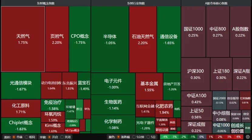 天然气、页岩气、化工原料、化肥农药、石油天然气等周期股护盘,但半导体、CPO概念、通信设备、光通信模块、电子元件、生物医药等热门板块出现回调。