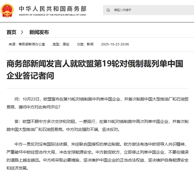 问:10月23日,欧盟宣布在第19轮对俄制裁中列单中国企业,并首次制裁中国大型炼油厂和石油贸易商,请问中方对此有何评论?