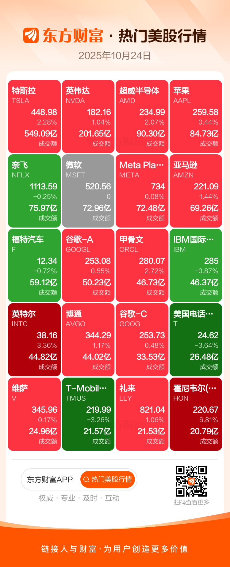 特斯拉涨2.28%,英伟达涨1.04%,超威半导体涨2.07%,苹果涨0.44%,奈飞跌0.25%,微软涨0.00%,Meta Platforms Inc-A涨0.08%,亚马逊涨1.44%,福特汽车跌0.72%,谷歌-A涨0.55%。