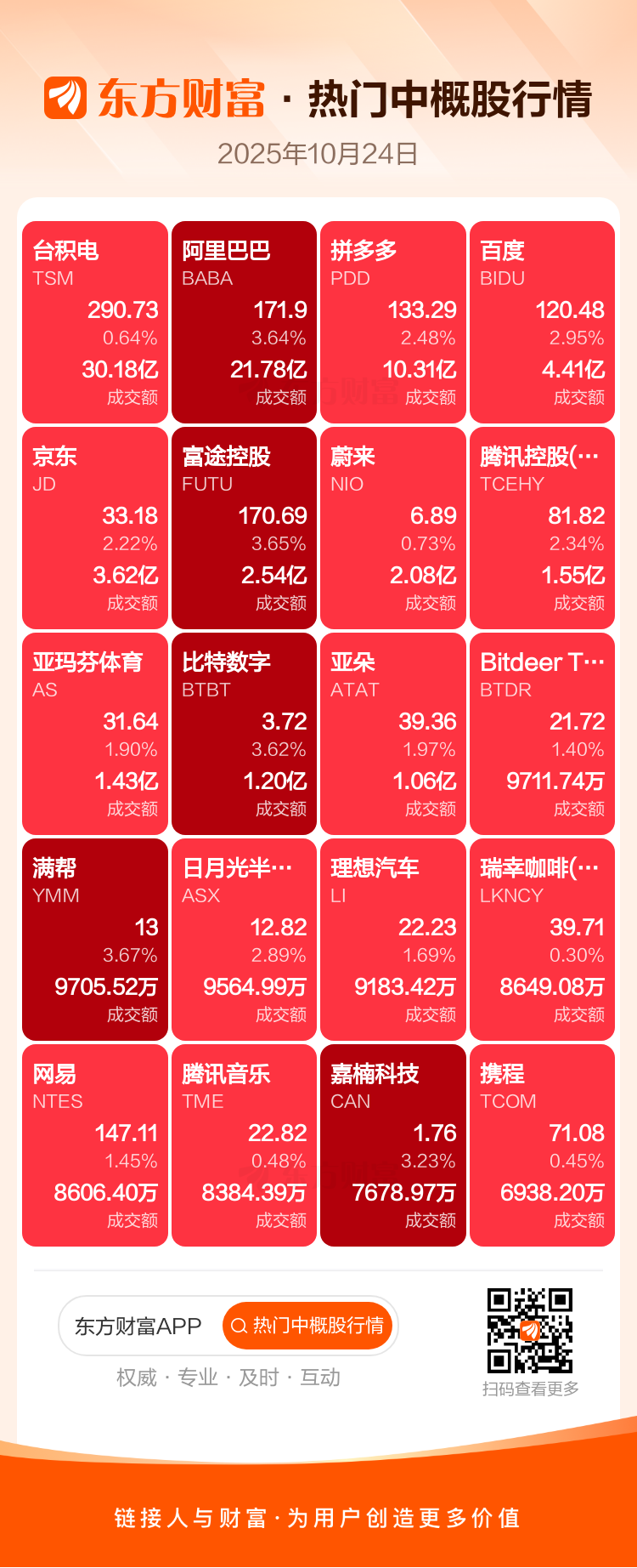 台积电涨0.64%,阿里巴巴涨3.64%,拼多多涨2.48%,百度涨2.95%,京东涨2.22%,富途控股涨3.65%,蔚来涨0.73%,腾讯控股(ADR)涨2.34%,亚玛芬体育涨1.90%,比特数字涨3.62%。