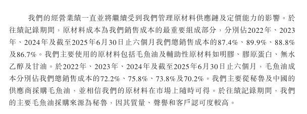 公司在产品中使用的原材料价格波动或任何无法获得原材料的情形,均可能会对公司的业务、经营业绩或财务状况造成重大不利影响。公司的原材料采购是销售成本中最大的组成部分,而原材料价格的显著波动,主要包括毛鱼油,可能对公司的业务、经营业绩及财务状况产生重大影响。2022年、2023年、2024年以及2025年上半年,原材料成本分别占总销售成本的87.4%、89.9%、88.8%及86.7%。未来,公司预计原材料成本将继续占公司销售成本的很大一部分。因此,任何主要原材料价格的显著上涨均可能会对公司利润率造成重大不利影响。