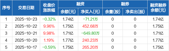 融资方面,当日融资买入9569.69万元,融资偿还9640.9万元,融资净偿还71.21万元。融券方面,融券卖出0股,融券偿还0股,融券余量0股,融券余额0元。融资融券余额合计1.74亿元。