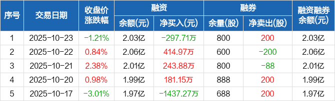 融资方面,当日融资买入728.01万元,融资偿还1025.72万元,融资净偿还297.71万元。融券方面,融券卖出200股,融券偿还0股,融券余量800股,融券余额4.56万元。融资融券余额合计2.03亿元。