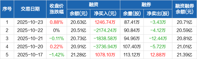 融资方面,当日融资买入1.25亿元,融资偿还1.13亿元,融资净买入1246.74万元。融券方面,融券卖出4.48万股,融券偿还7.91万股,融券余量87.41万股,融券余额798.05万元。融资融券余额合计20.71亿元。