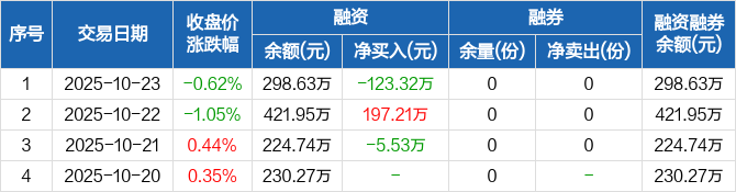 融资方面,当日融资买入258.41万元,融资偿还381.73万元,融资净偿还123.32万元。融券方面,融券卖出0份,融券偿还0份,融券余量0份,融券余额0元。融资融券余额合计298.63万元。