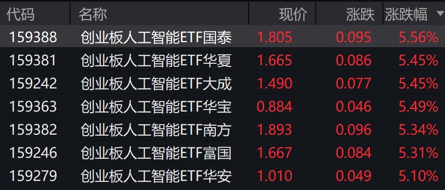 受盘面影响,创业板人工智能相关ETF涨超5%。