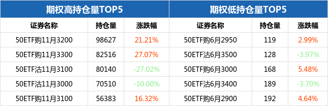 从持仓量来看,50ETF期权合约中,50ETF购11月3200持仓量最大,为98627张,期权全日上涨21.21%,报收0.056元;持仓量最小的为50ETF购6月2950,共计119张,期权全日上涨2.99%,报收0.3336元。