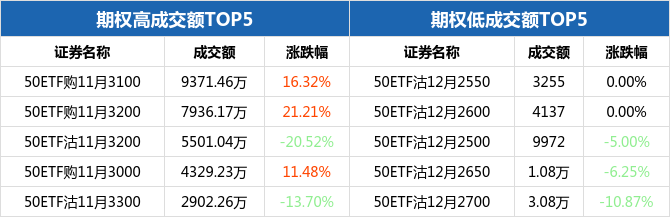 从成交额来看,50ETF期权合约中,50ETF购11月3100成交额最高,为9371.46万元,全日上涨16.32%,报收0.1162元;而最低的为50ETF沽12月2550,成交额为3255元,全日收平,报收0.0022元。