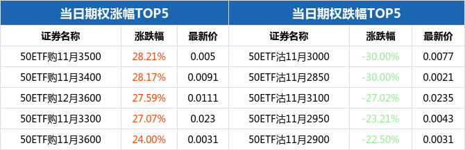 50ETF期权当日有100个合约正在交易。从涨跌幅来看,50ETF期权合约中,50ETF购11月3500涨幅最大,为28.21%,报收0.005元;50ETF沽11月2850跌幅最大,为30.00%,报收0.0021元。
