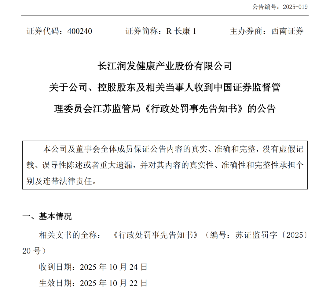 上证报记者了解到,注册地位于苏州的长江润发健康产业股份有限公司(此前证券简称“长江健康”“ST长康”)曾现40个跌停,因触发“连续二十个交易日的每日股票收盘价均低于1元”的退市规则,于2024年8月15日退市摘牌。在退市一年多后收到《行政处罚事先告知书》,这是对公司此前违规行为的严肃追责。这张“罚单”也彰显了监管部门对资本市场违法违规行为的“零容忍”态度,决不允许“一退了之”。