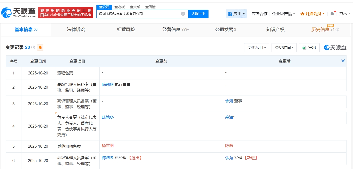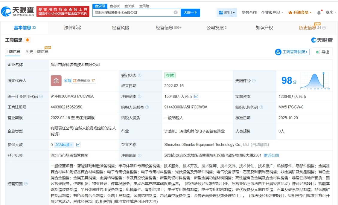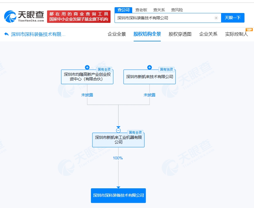 每经AI快讯,天眼查App显示,近日,深圳市深科装备技术有限公司发生工商变更,陈勉冬卸任法定代表人、执行董事、总经理,由余海接任法定代表人,并担任董事、经理。深圳市深科装备技术有限公司成立于2022年2月,注册资本约15亿元,经营范围包括智能基础制造装备销售、半导体器件专用设备销售、电子专用设备销售等。股权全景穿透图显示,该公司由新凯来旗下深圳市新凯来工业机器有限公司全资持股。