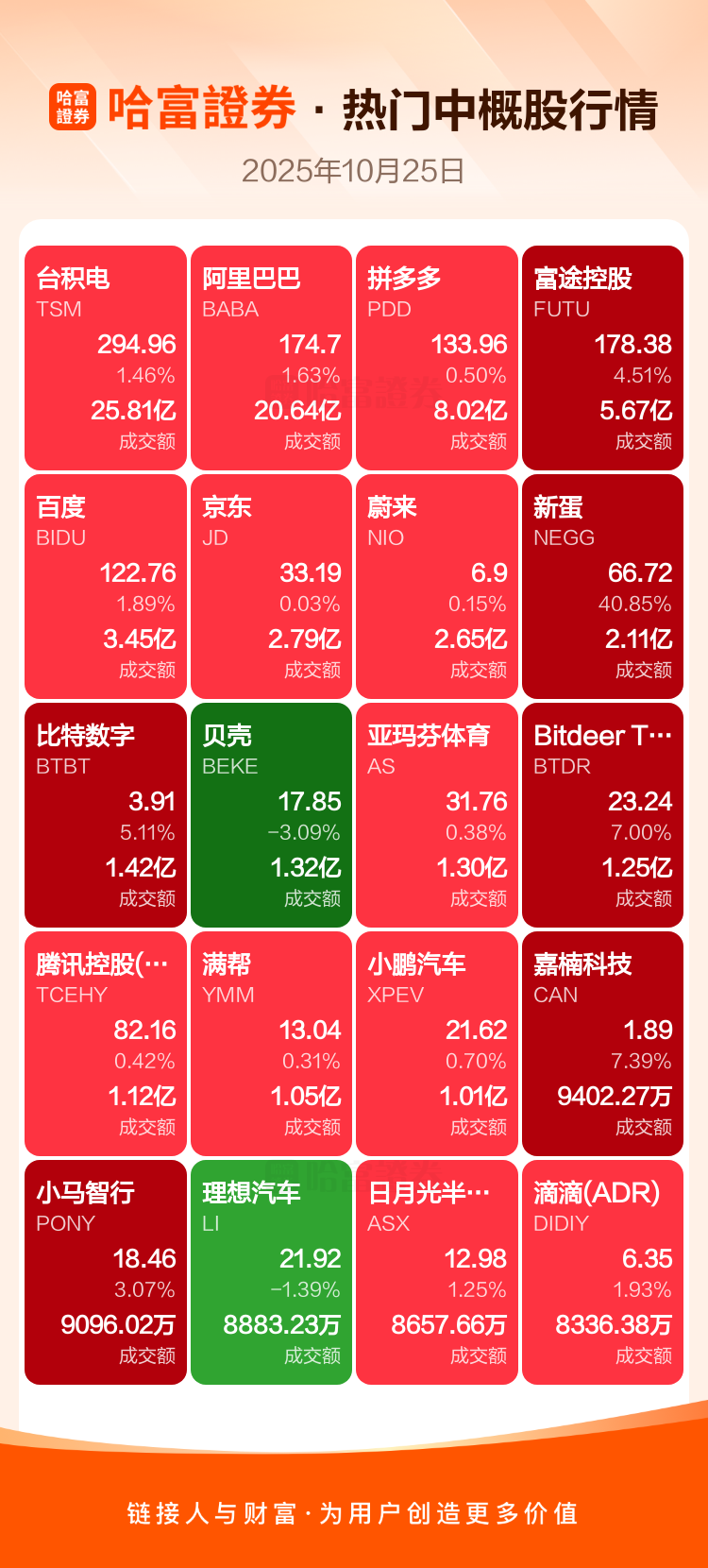 台积电涨1.46%,阿里巴巴涨1.63%,拼多多涨0.50%,富途控股涨4.51%,百度涨1.89%,京东涨0.03%,蔚来涨0.15%,新蛋涨40.85%,比特数字涨5.11%,贝壳跌3.09%。