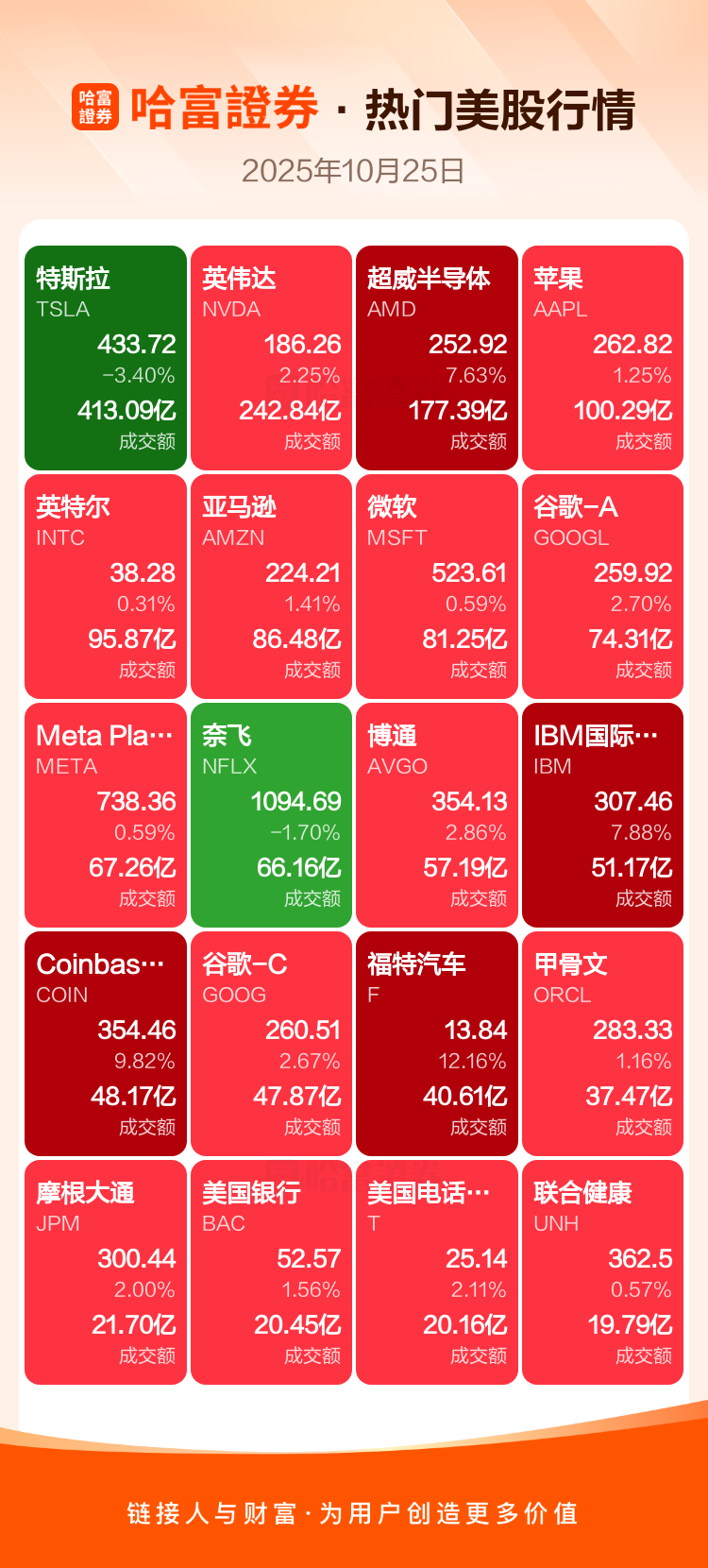 特斯拉跌3.40%,英伟达涨2.25%,超威半导体涨7.63%,苹果涨1.25%,英特尔涨0.31%,亚马逊涨1.41%,微软涨0.59%,谷歌-A涨2.70%,Meta Platforms Inc-A涨0.59%,奈飞跌1.70%。