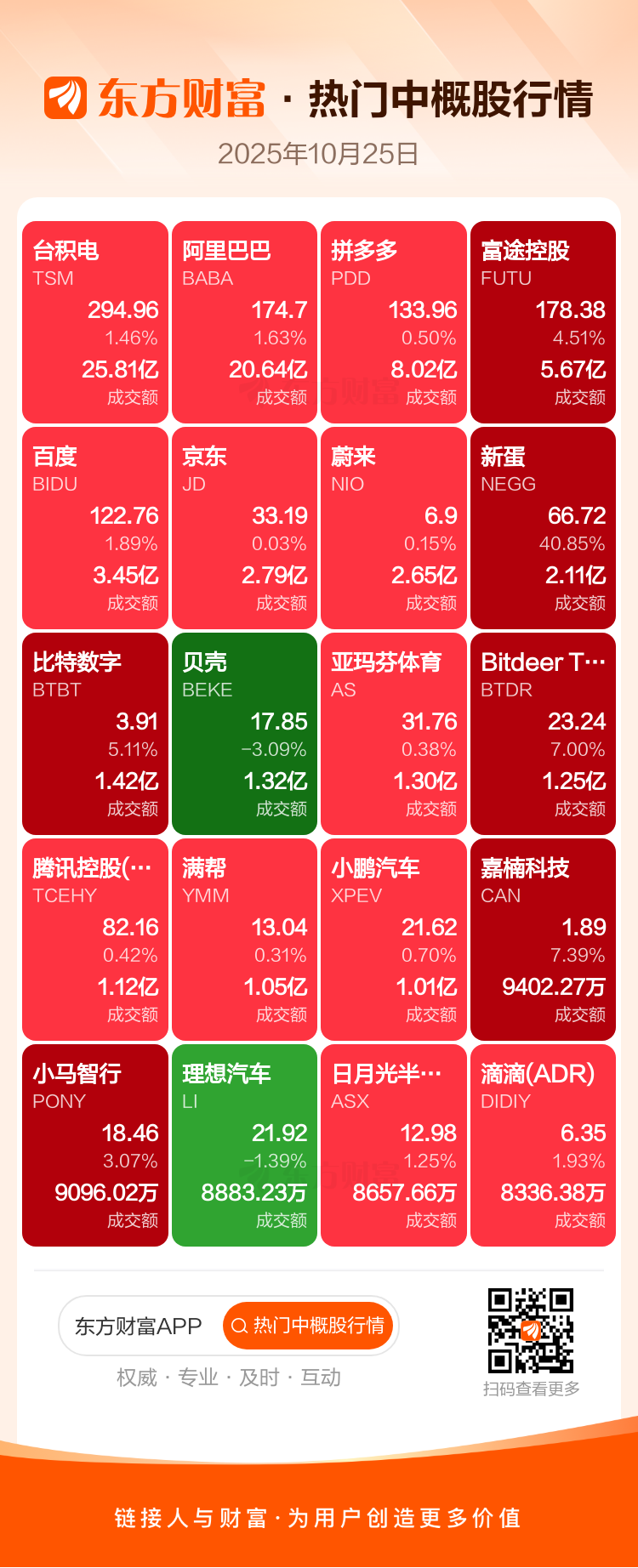 台积电涨1.46%,阿里巴巴涨1.63%,拼多多涨0.50%,富途控股涨4.51%,百度涨1.89%,京东涨0.03%,蔚来涨0.15%,新蛋涨40.85%,比特数字涨5.11%,贝壳跌3.09%。