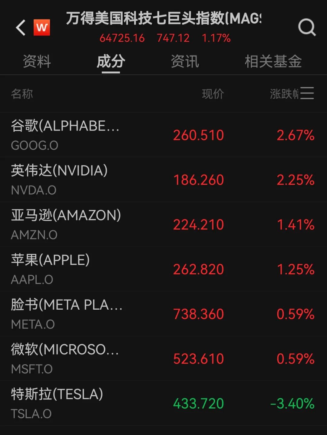 美股大型科技股多数上涨,万得美国科技七巨头指数上涨1.17%,其中,谷歌-C、英伟达涨逾2%,苹果、亚马逊涨超1%。