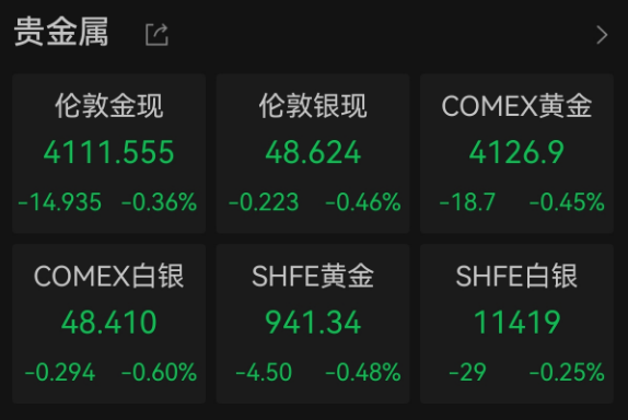 当地时间10月24日,国际黄金价格普遍收跌,COMEX黄金期货跌0.45%报4126.90美元/盎司,本周累计下跌2.05%;伦敦现货黄金跌0.36%,报4111.56美元/盎司,本周累计下跌3.29%。