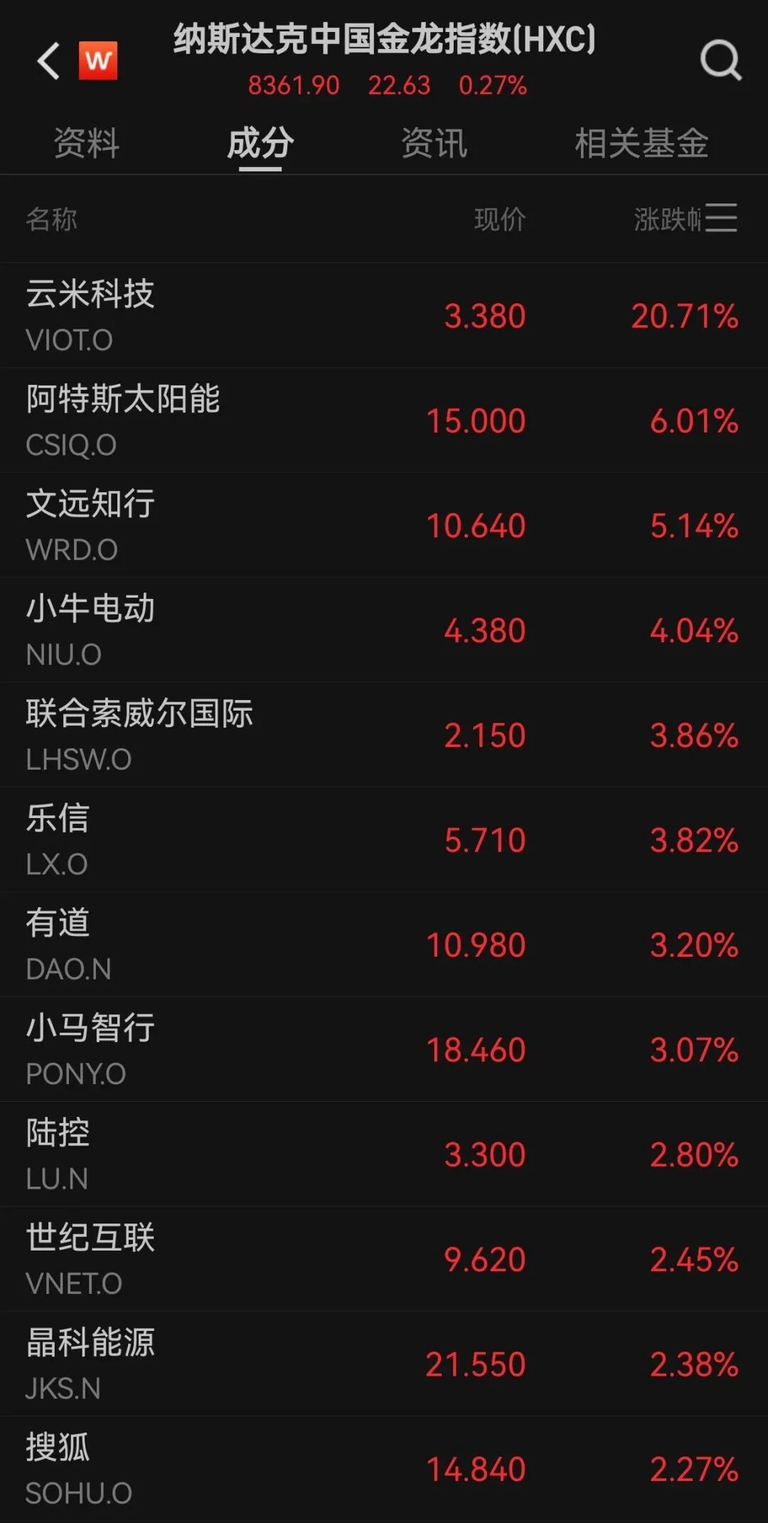 中概股涨跌不一,纳斯达克中国金龙指数涨0.27%。云米科技涨超20%,阿特斯太阳能涨超6%。
