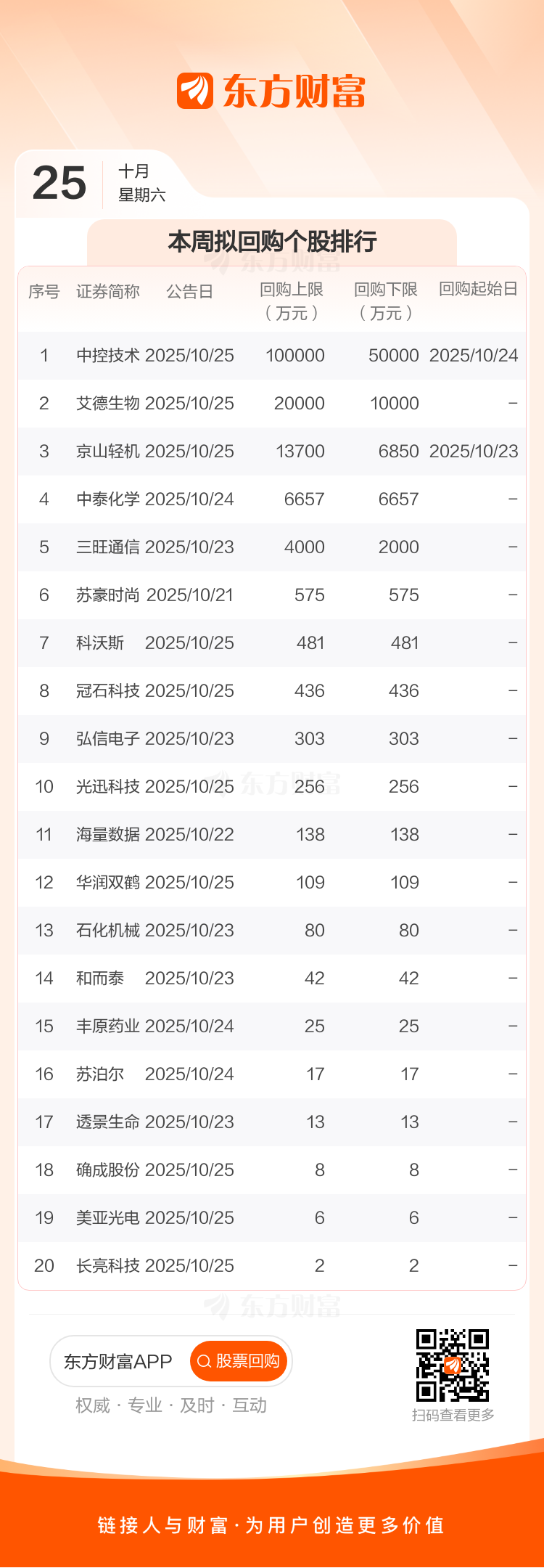 本周有23家公司宣布回购计划,按拟回购金额上限统计,计划回购金额14.68亿元。其中中控技术拟回购金额上限最高,为10.00亿元。