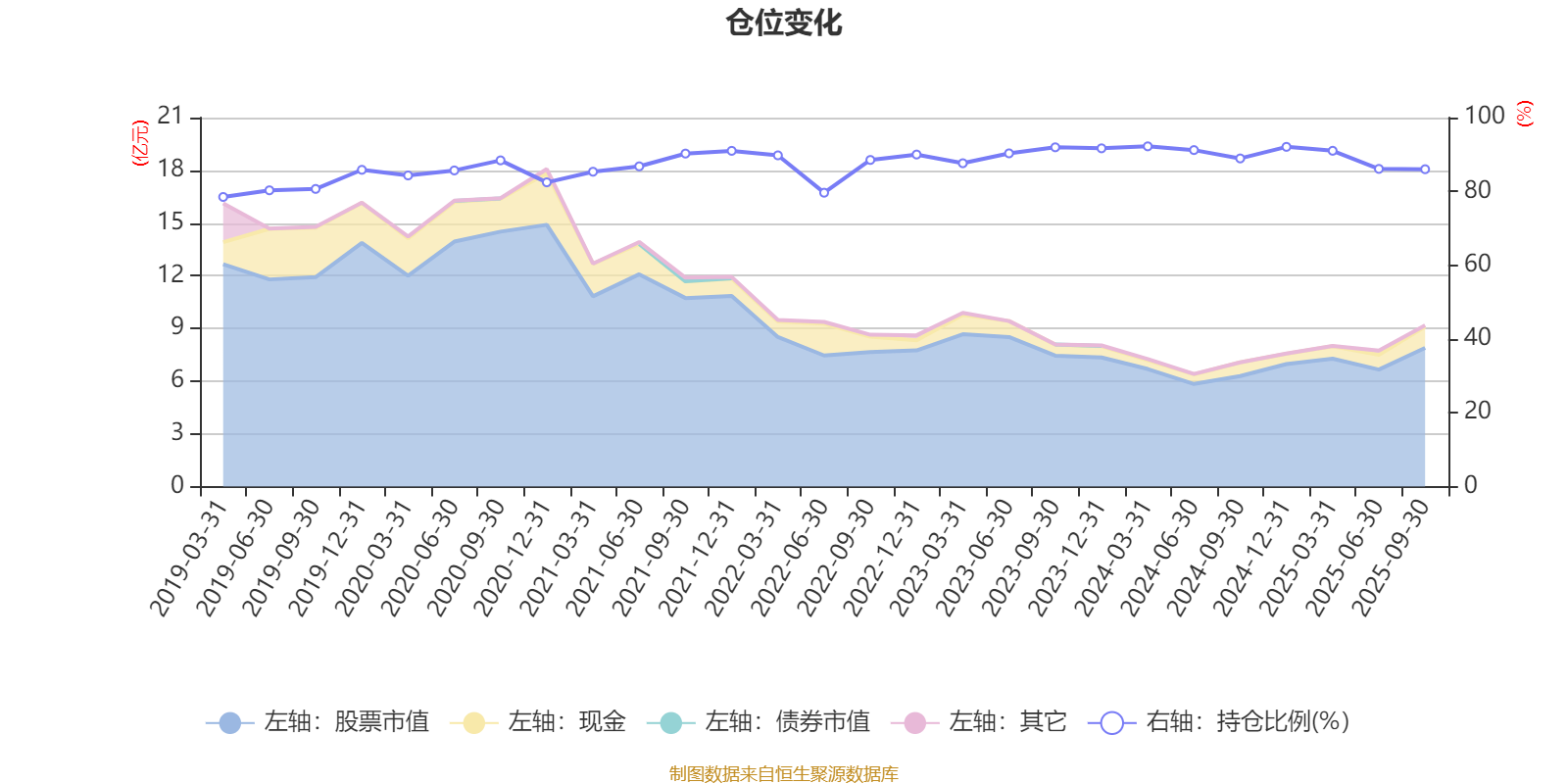 据定期报告数据统计,近三年平均股票仓位为89.92%,同类平均为72.14%。2024年一季度末基金达到92.21%的最高仓位,2019年一季度末最低,为78.49%。