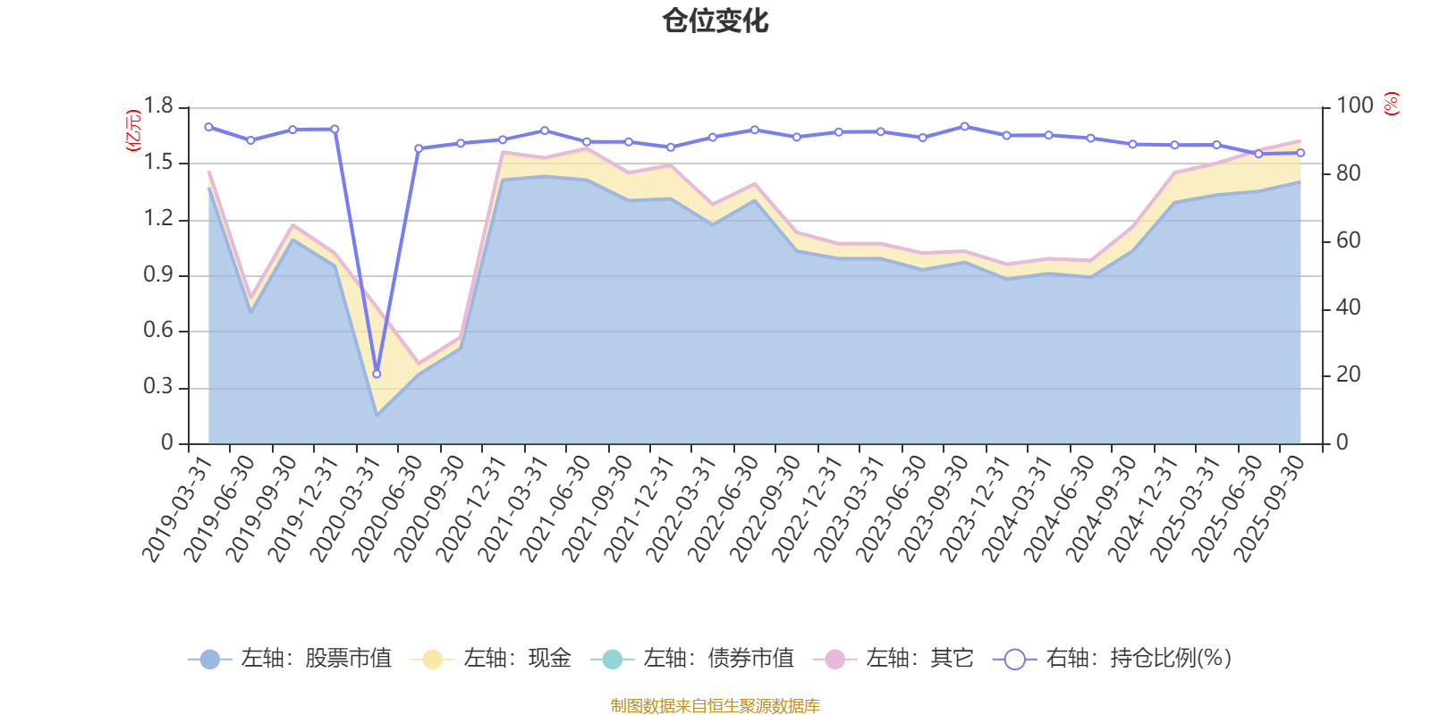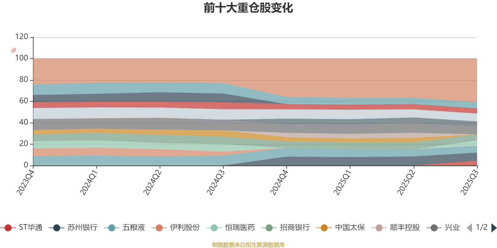 该基金持股集中度较高,且持股标的较为稳定。截至2025年三季度末,基金十大重仓股分别是苏州银行、兴业银行、美的集团、五粮液、贵州茅台、招商银行、恒瑞医药、平安银行、中国平安、ST华通。