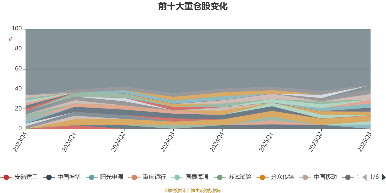 截至2025年三季度末,基金十大重仓股分别是分众传媒、长江电力、中国平安、工业富联、阳光电源、中国汽研、黔源电力、苏泊尔、招商银行、国泰海通。