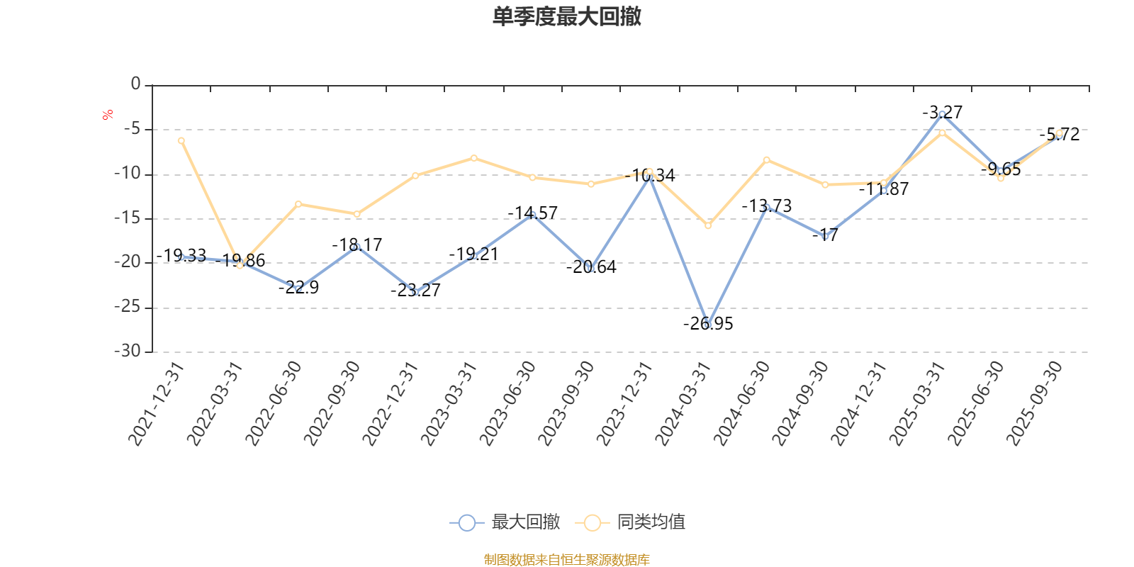 截至10月24日,基金近三年最大回撤为55.18%,同类可比基金排名247/252。单季度最大回撤出现在2024年一季度,为26.95%。