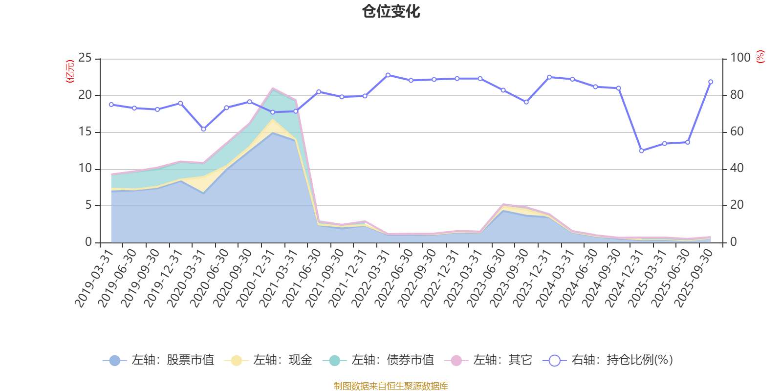 据定期报告数据统计,近三年平均股票仓位为77.58%,同类平均为72.18%。2022年一季度末基金达到91.1%的最高仓位,2024年末最低,为49.95%。