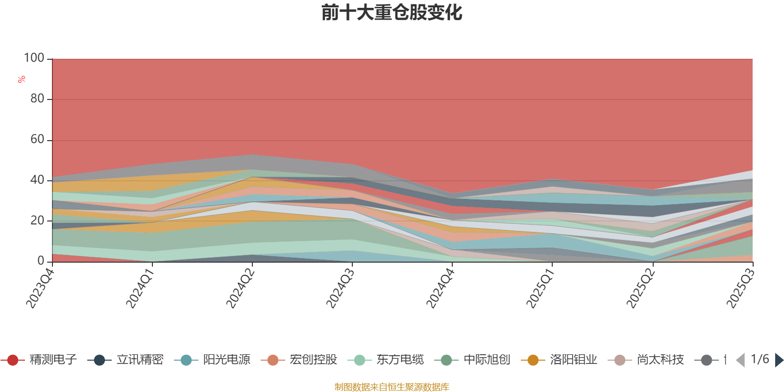 截至2025年三季度末,基金十大重仓股分别是中际旭创、新易盛、兆易创新、纳科诺尔、宁德时代、金诚信、芯碁微装、厦门钨业、宏创控股、中航沈飞。