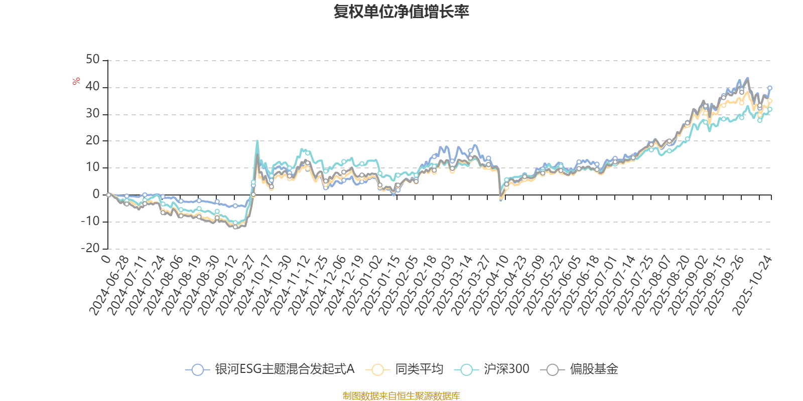 截至10月24日,银河ESG主题混合发起式A近三个月复权单位净值增长率为16.65%,位于同类可比基金252/689;近半年复权单位净值增长率为30.81%,位于同类可比基金264/688;近一年复权单位净值增长率为27.56%,位于同类可比基金312/653。