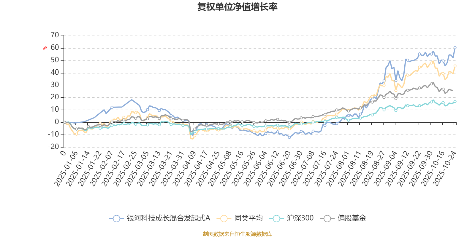 截至10月24日,银河科技成长混合发起式A近三个月复权单位净值增长率为61.83%,位于同类可比基金12/229;近半年复权单位净值增长率为68.50%,位于同类可比基金65/229。