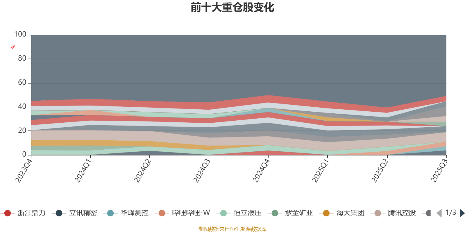 截至2025年三季度末,基金十大重仓股分别是阿里巴巴-W、腾讯控股、宁德时代、中芯国际、美团-W、快手-W、哔哩哔哩-W、立讯精密、华峰测控、贝壳-W。
