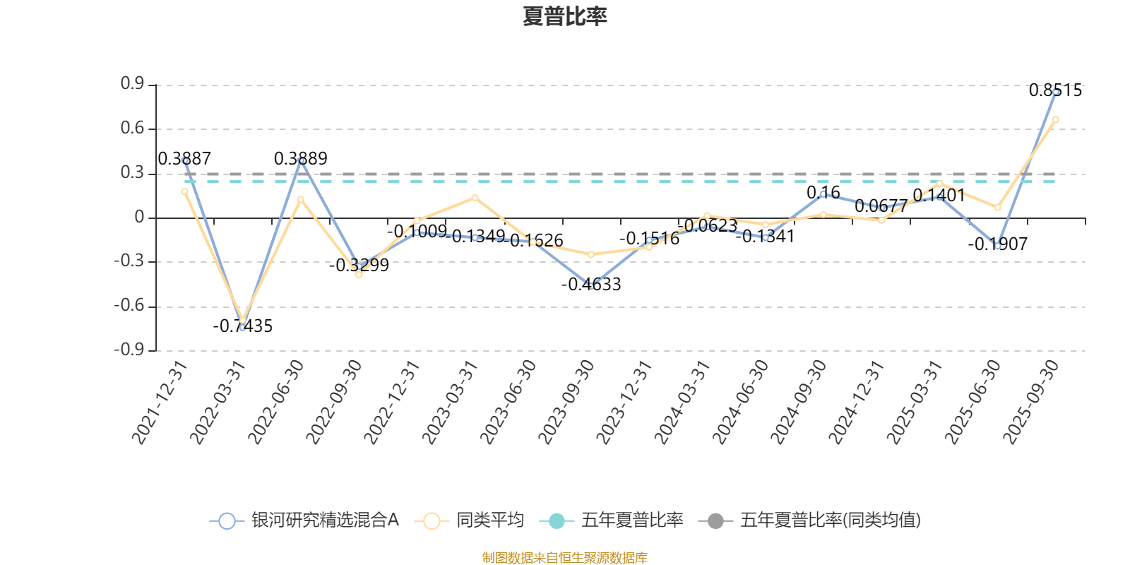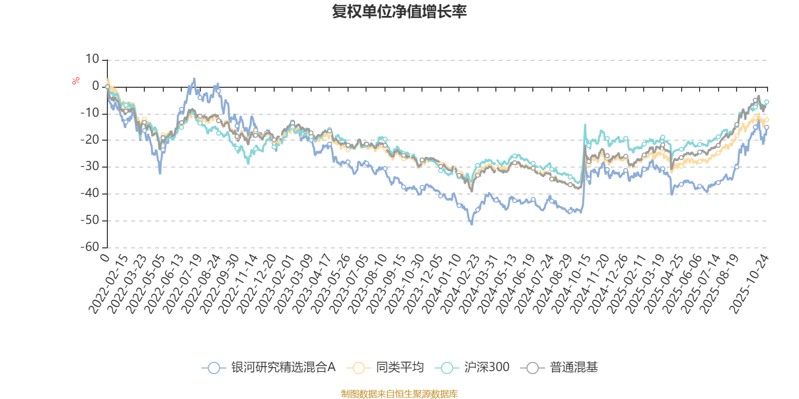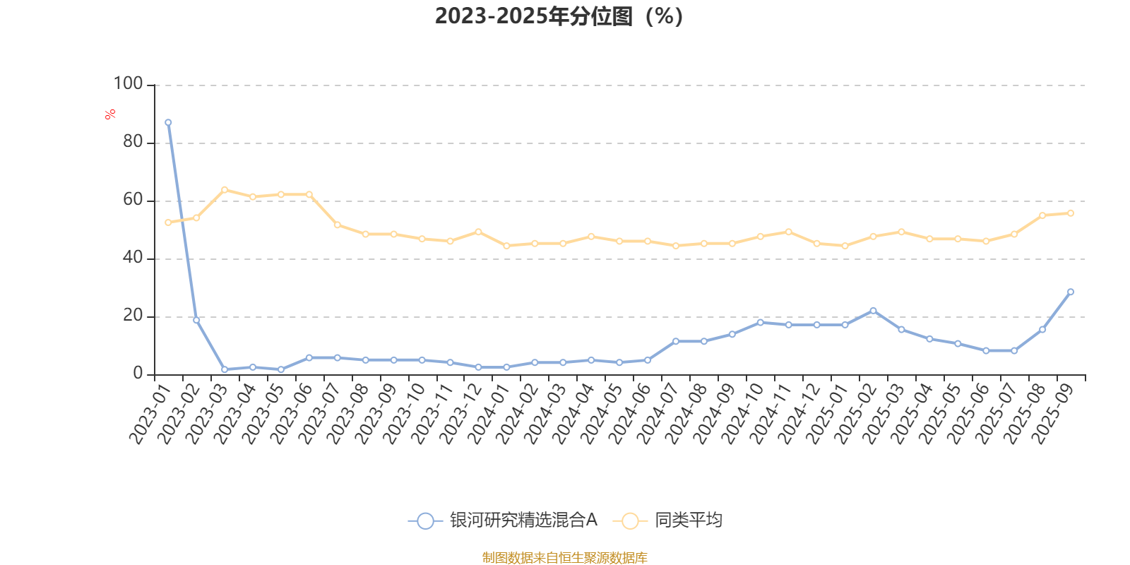 截至10月24日,银河研究精选混合A近三个月复权单位净值增长率为28.55%,位于同类可比基金9/134;近半年复权单位净值增长率为33.52%,位于同类可比基金26/134;近一年复权单位净值增长率为25.10%,位于同类可比基金46/130;近三年复权单位净值增长率为1.83%,位于同类可比基金97/119。
