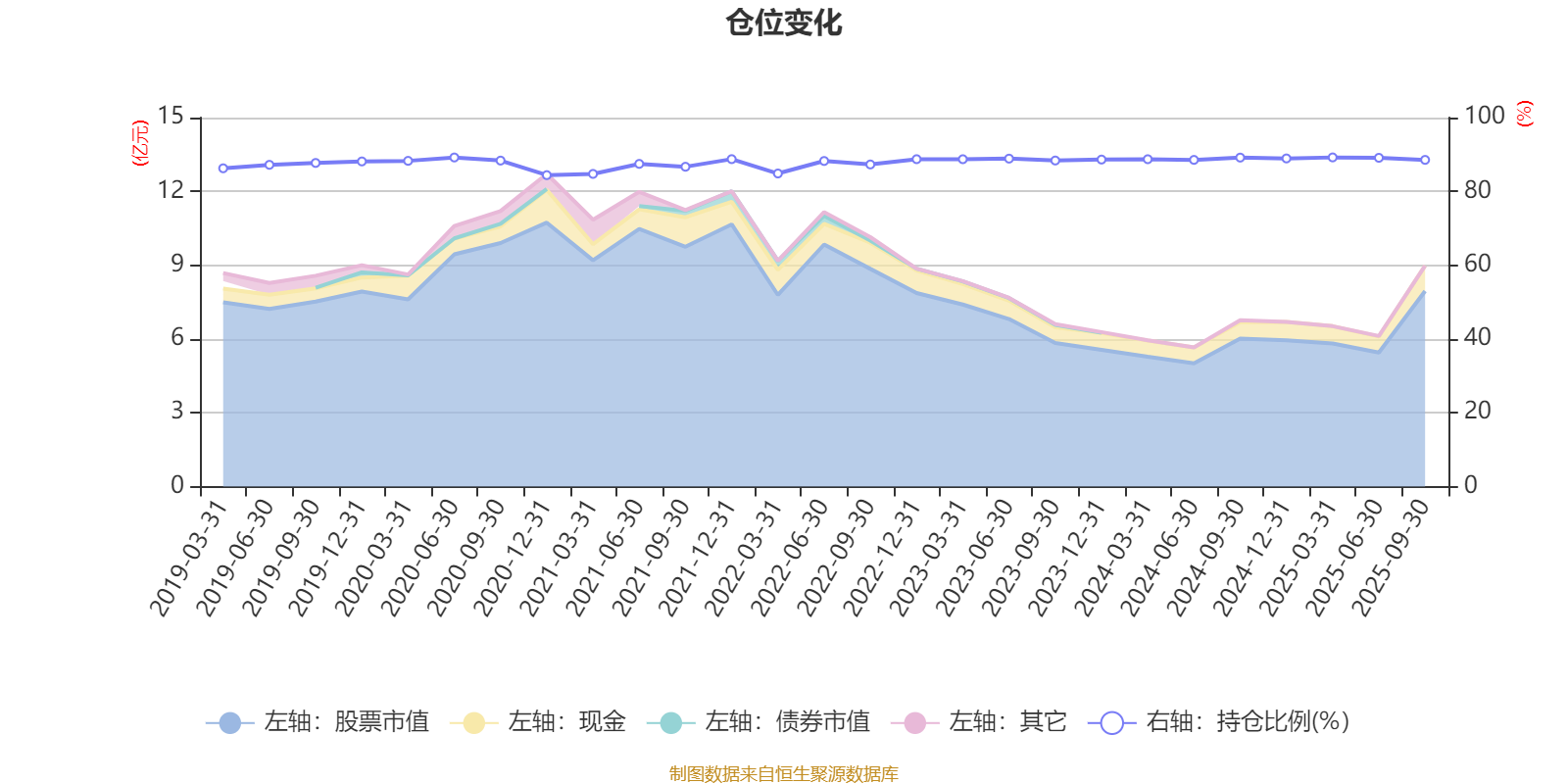 据定期报告数据统计,近三年平均股票仓位为88.79%,同类平均为67.21%。2025年一季度末基金达到89.21%的最高仓位,2020年末最低,为84.41%。