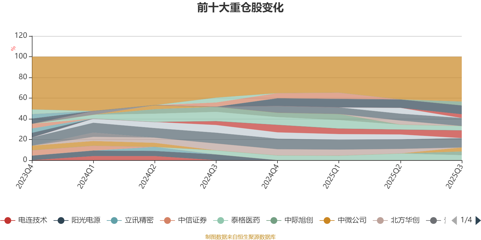 截至2025年三季度末,基金十大重仓股分别是宁德时代、中芯国际、海光信息、寒武纪、泰格医药、德业股份、中微公司、兆易创新、源杰科技、中际旭创。