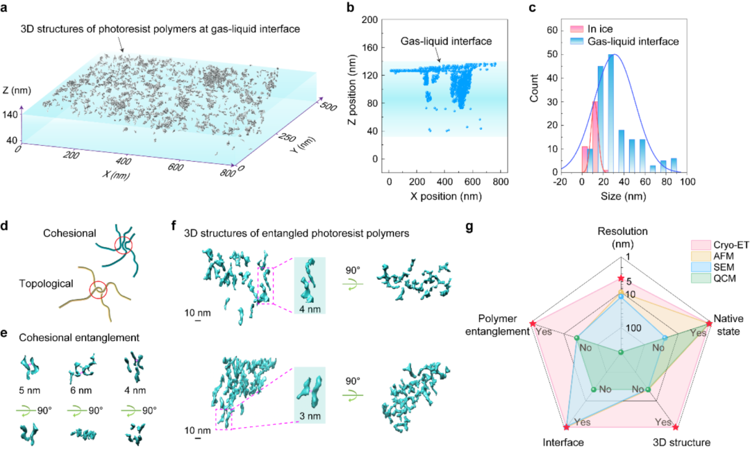 为破解难题,研究团队首次将冷冻电子断层扫描技术引入半导体领域。他们在晶圆上进行标准的光刻曝光后,将含有光刻胶聚合物的显影液快速吸取到电镜载网上,并在毫秒内将其急速冷冻至玻璃态,“定格”光刻胶在溶液中的真实状态。