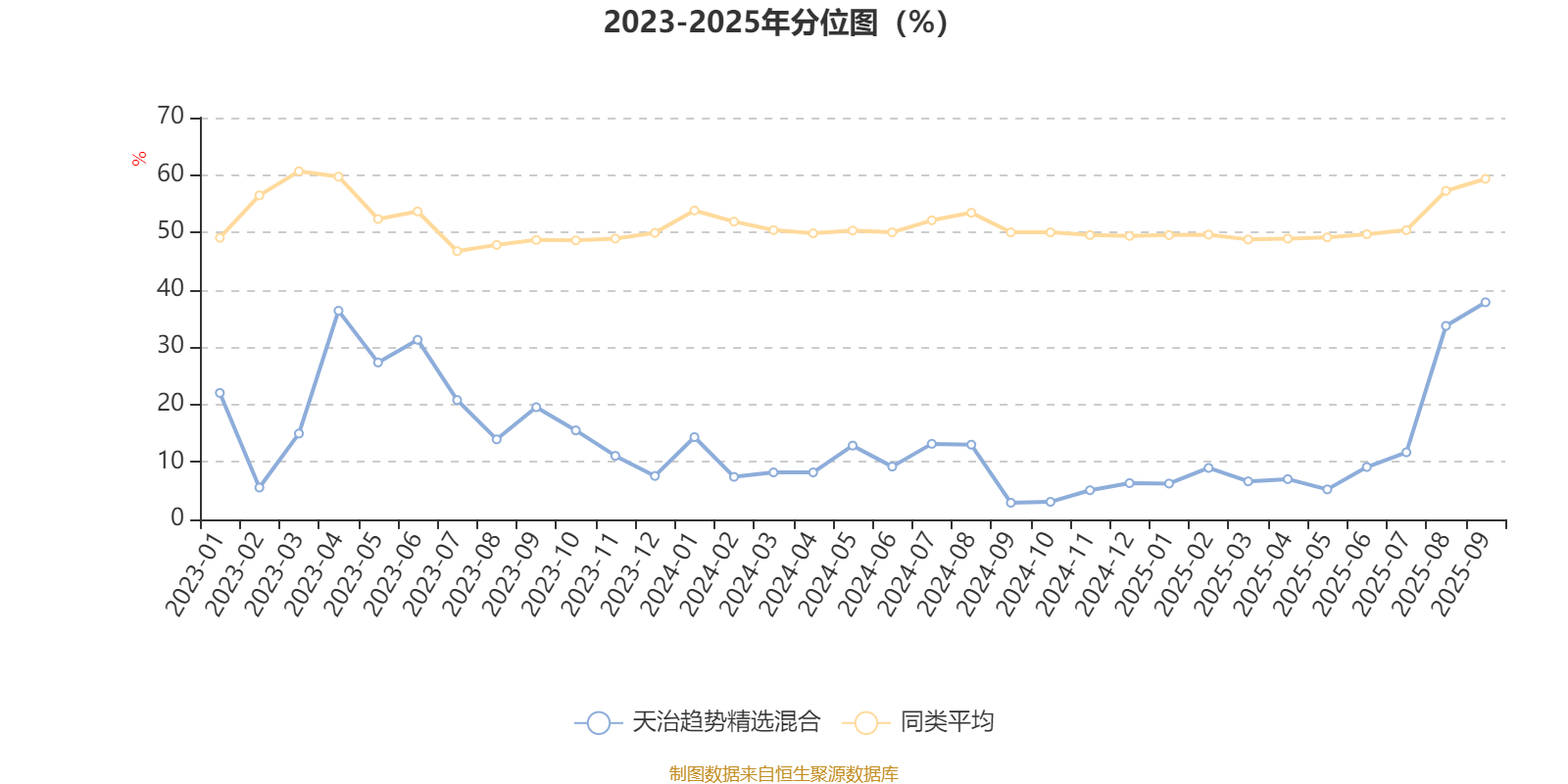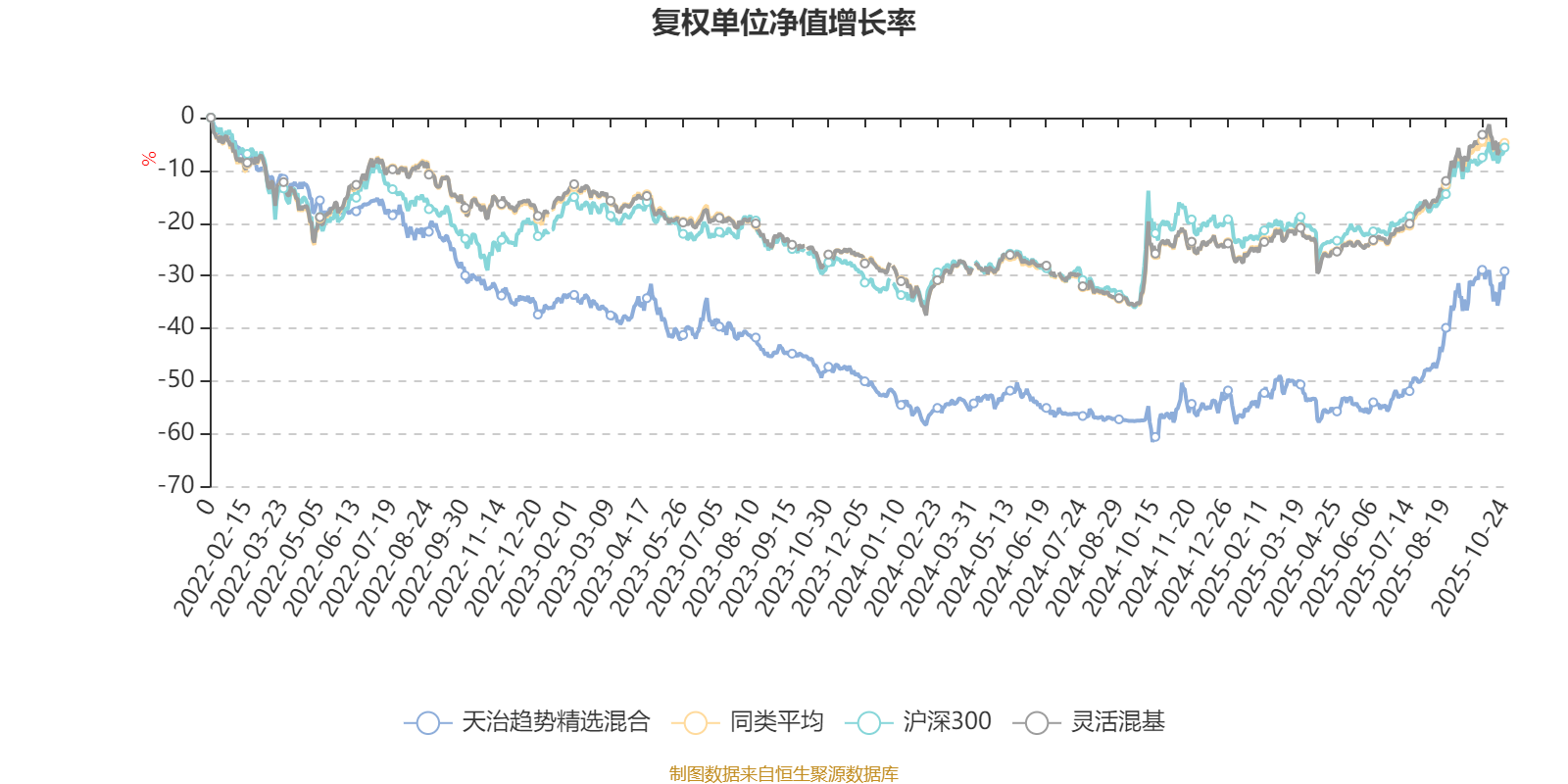 截至10月24日,天治趋势精选混合近三个月复权单位净值增长率为41.69%,位于同类可比基金67/1287;近半年复权单位净值增长率为60.91%,位于同类可比基金84/1287;近一年复权单位净值增长率为63.40%,位于同类可比基金79/1287;近三年复权单位净值增长率为2.68%,位于同类可比基金918/1286。