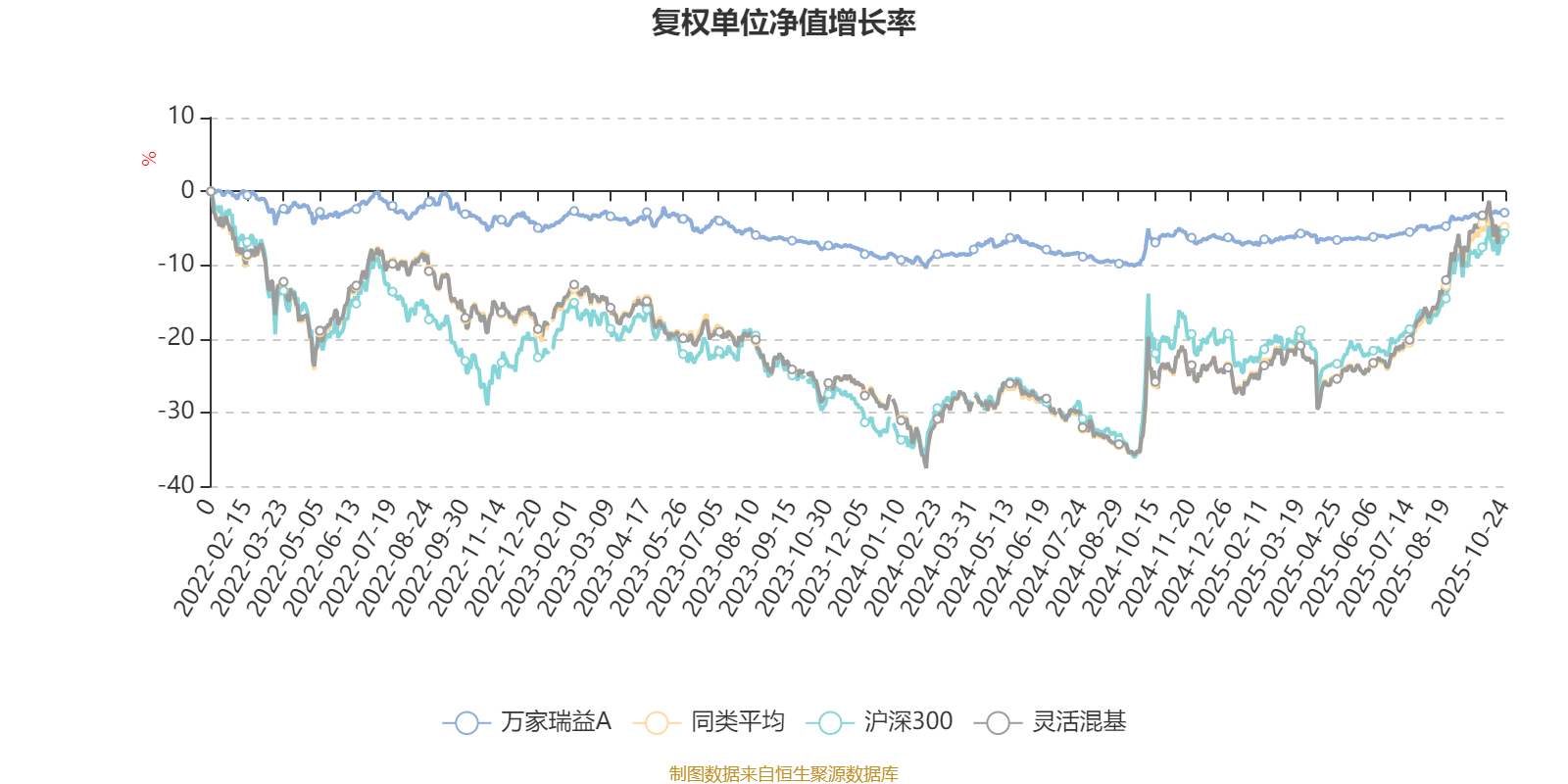 截至10月24日,万家瑞益A近三个月复权单位净值增长率为1.83%,位于同类可比基金1084/1287;近半年复权单位净值增长率为3.95%,位于同类可比基金1169/1287;近一年复权单位净值增长率为3.47%,位于同类可比基金1183/1287;近三年复权单位净值增长率为1.25%,位于同类可比基金945/1286。