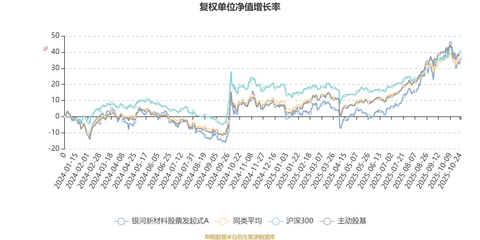 截至10月24日,银河新材料股票发起式A近三个月复权单位净值增长率为18.98%,位于同类可比基金40/121;近半年复权单位净值增长率为34.62%,位于同类可比基金41/121;近一年复权单位净值增长率为26.19%,位于同类可比基金56/115。